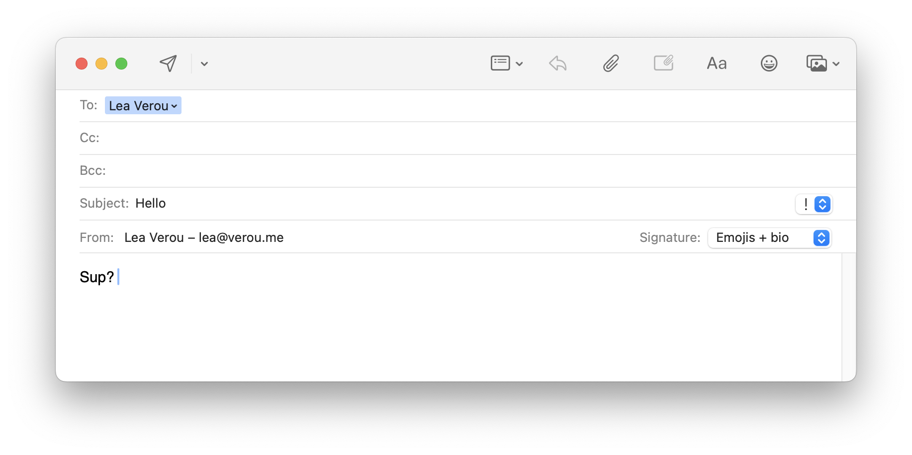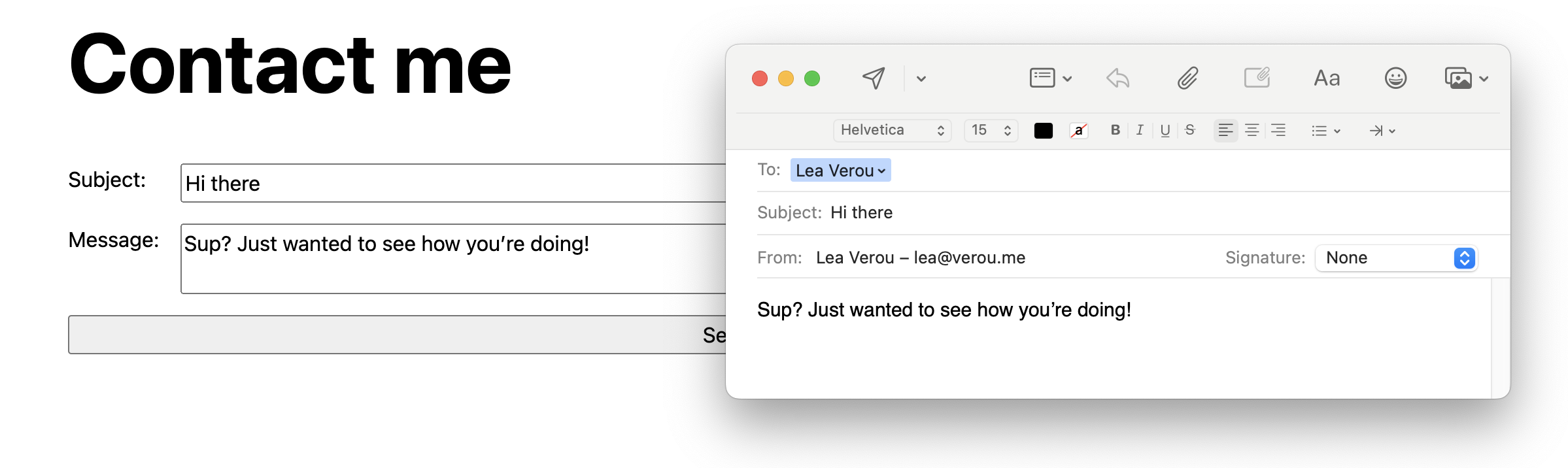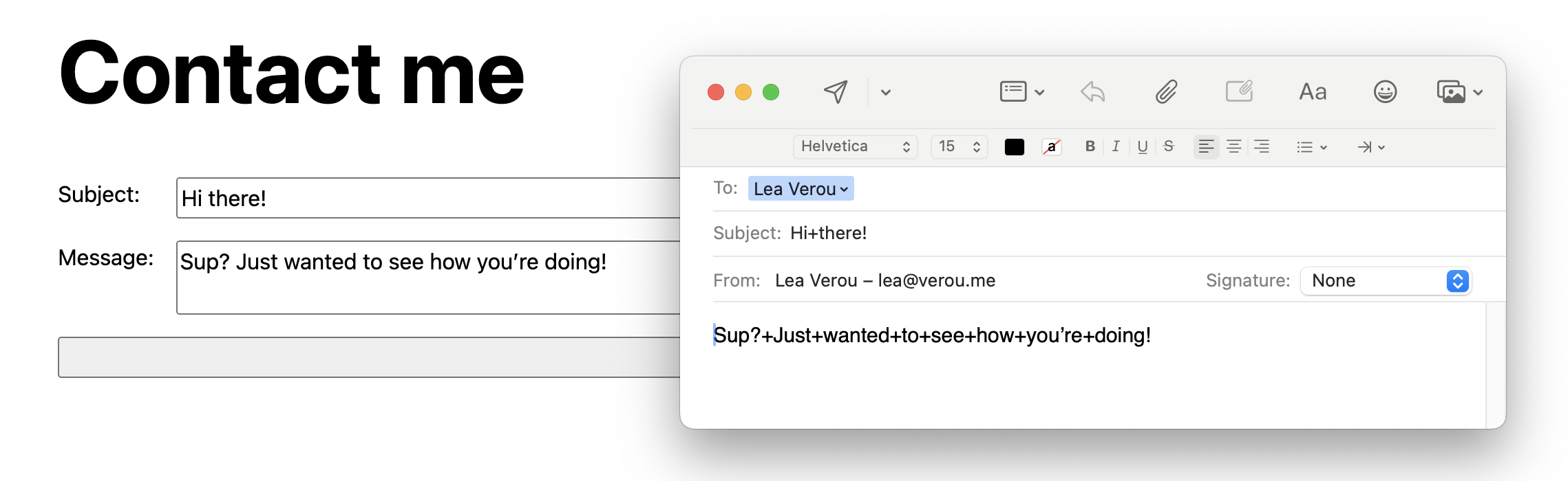 Recall that we’re using method="GET" on our form. An HTTP GET request encodes all submitted information in the URL, so our form basically helps us build (and visits) a URL like mailto:leaverou@mit.edu?subject=Hello&body=Sup?. Try pasting that URL in your browser, and notice how it opens exactly the same window you’d get by submitting your form!