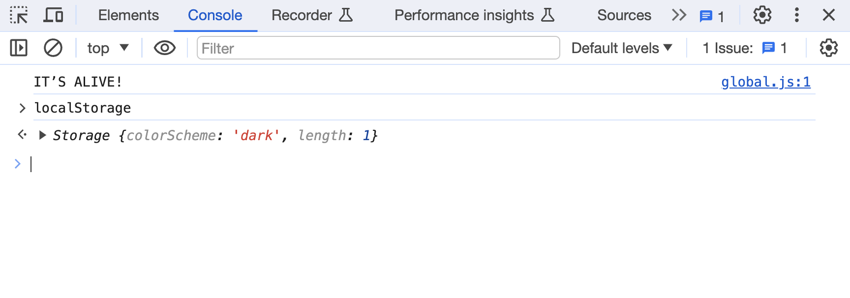 You can say the same thing multiple ways! Here is the same logic expressed with a conditional operator: let colorScheme = localStorage.colorScheme ? localStorage.colorScheme : "light dark"; And here is the same logic expressed with a nullish coalescing operator: let colorScheme = localStorage.colorScheme ?? "light dark"; However, if you try this code in Svelte, you will get an error. This is because, just like document, localStorage is a browser-specific variable that is not defined in Node.js.