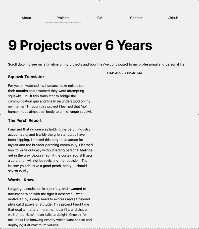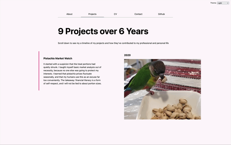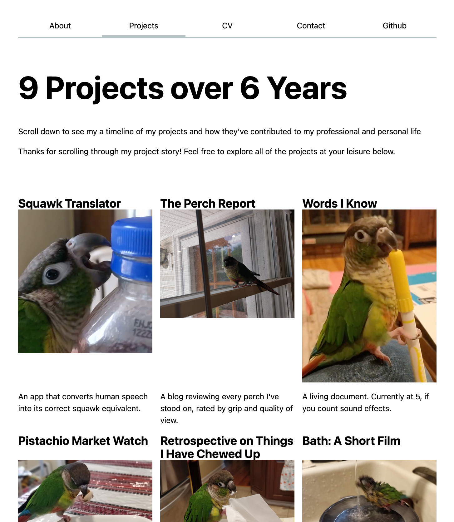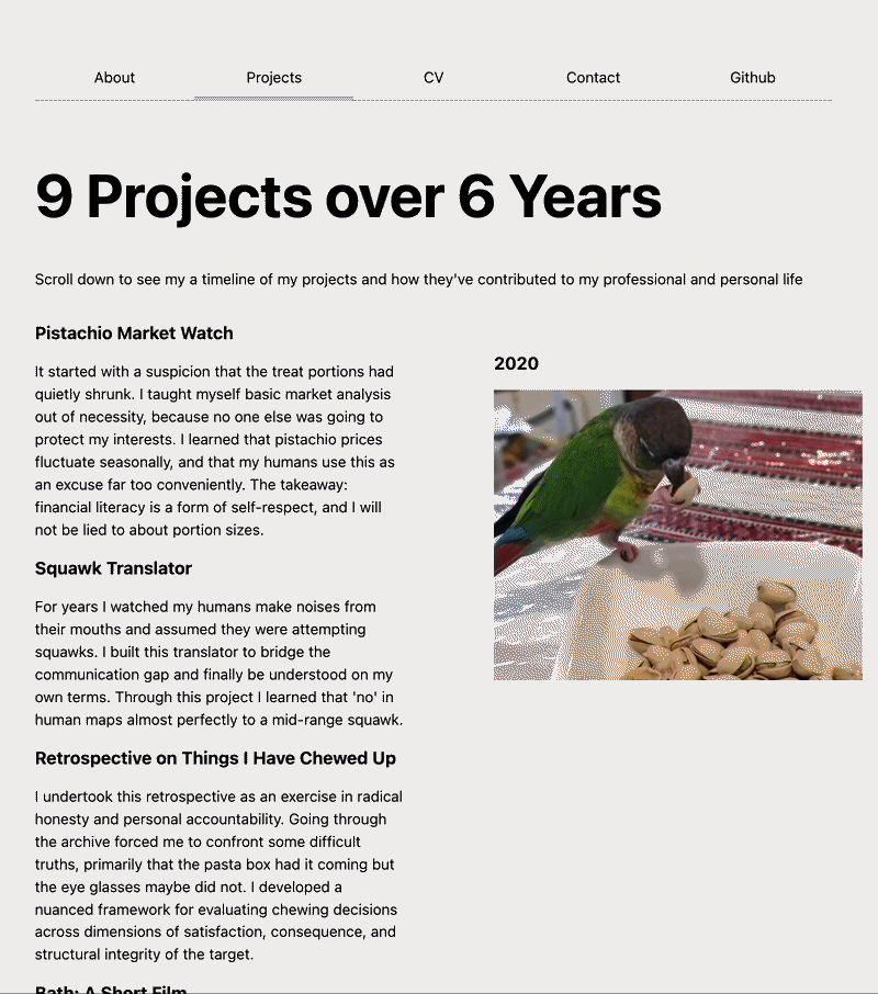 - Scrollytelling on the projects page lists projects in chronological order, with one project sticking to the top at a time