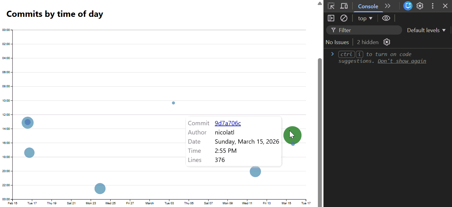 The software engineer inside of you might be compelled to put clickedCommits.includes(commit) into a helper function as we will also reuse it in the circle SVG component in the next step. For your mental sanity: don’t, unless you make certain key components reactive. If you choose to do the optional brushing part of this lab, you will see another flavor using the reactive paradigm.