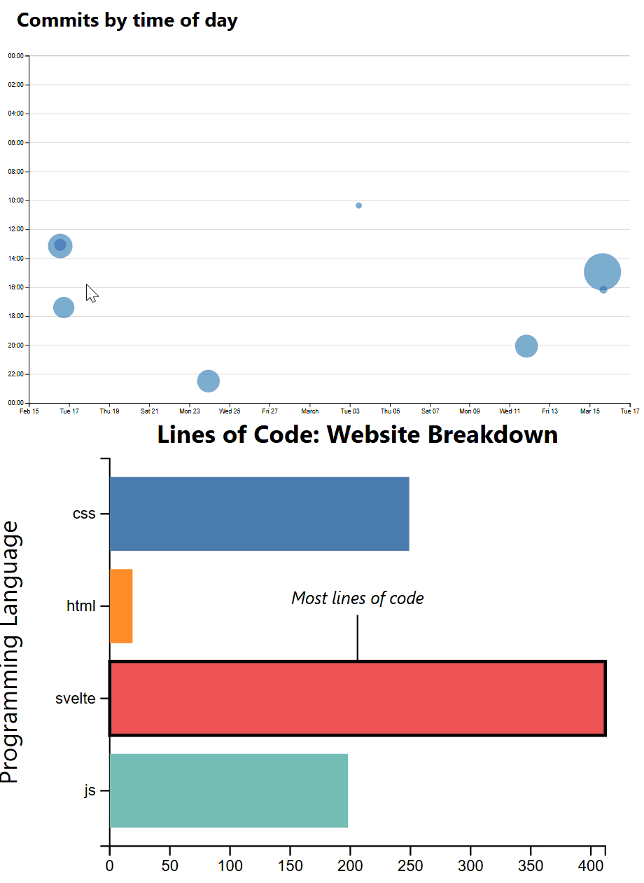 First, we need to edit our data passed to our horizontal bar chart svelte component (BarHorizontal.svelte) to only include lines from the selected commits – if commits have been selected. Importantly, you’ll want to show a bar for each language in the website, even if some commits have 0 lines in that language. Otherwise, the bar layout might distractingly change as commit selections change.