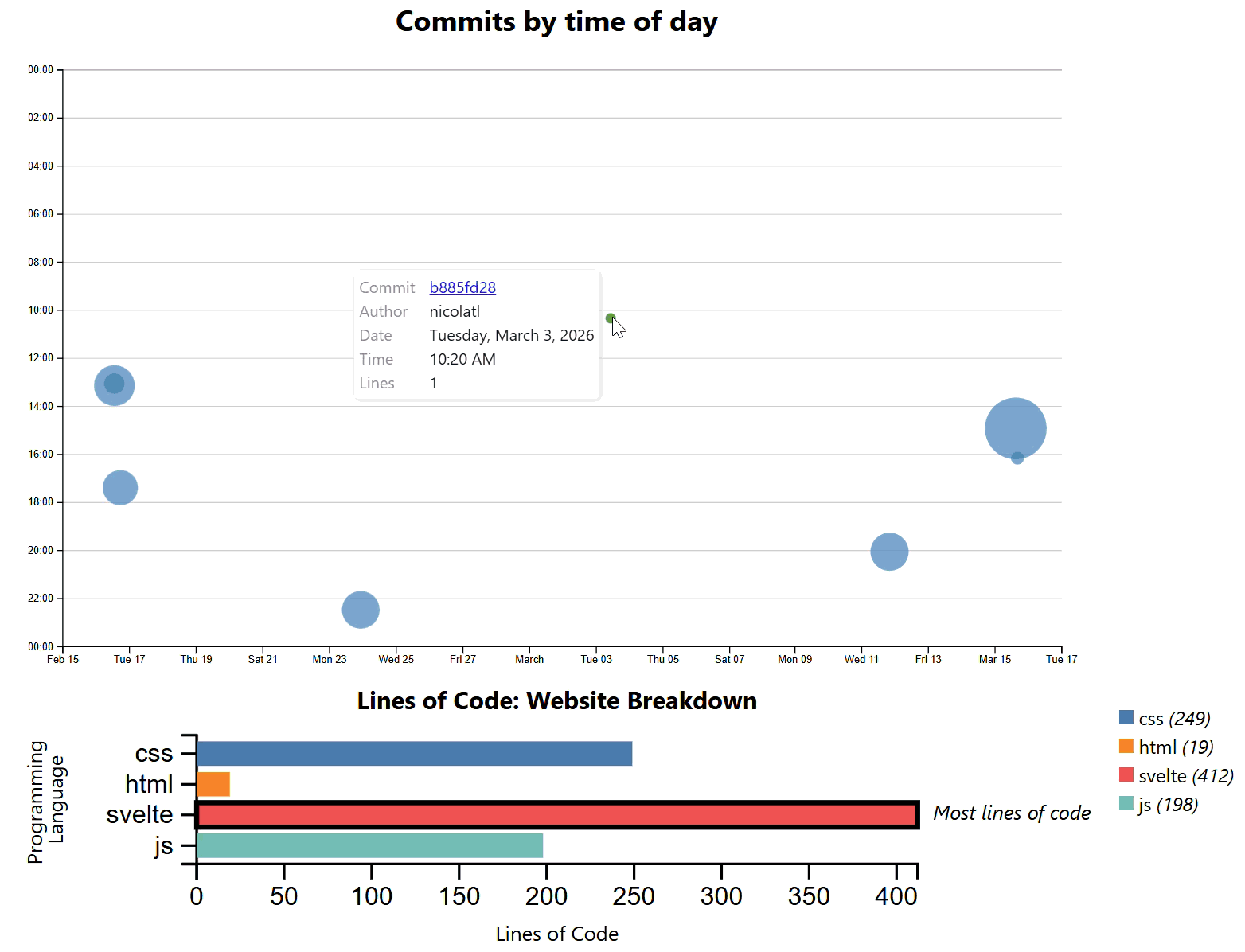 - Bar chart title correctly reflects whether the language breakdown is show for selected commits or for the entire website